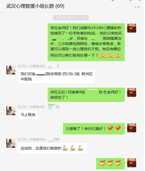 “紧急请求支援!我们接到一位求助者的来电……”由于成都市精神卫生中心援助武汉心理救援队没有直接对接患者所在医院,接到成都同事求助后,成都市精神卫生中心援助武汉心理救援队的周游医生很快便在全国援助武汉心理援助组长群里发布紧急求援消息。