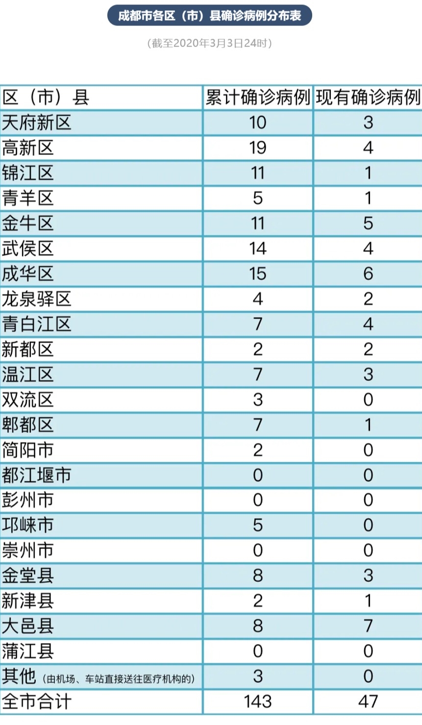 确诊病例分布表显示,截至3月3日24时,武侯区累计确诊病例14例、现有确诊病例4例。与昨日的数据相比,现有确诊病例减少1例。
