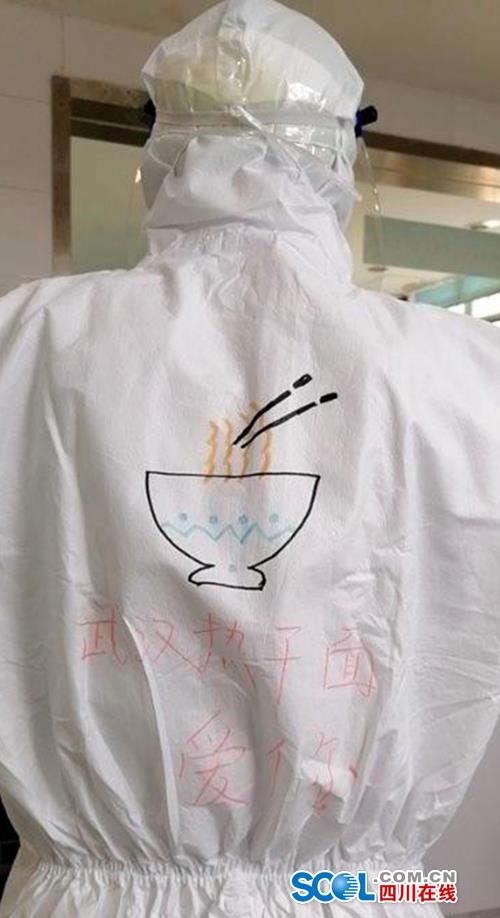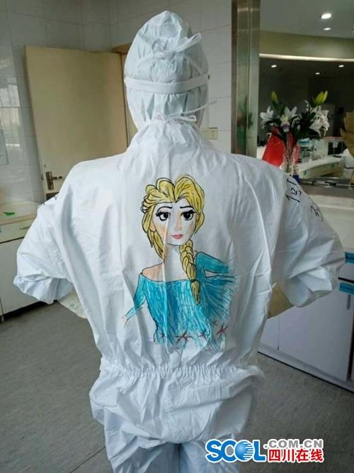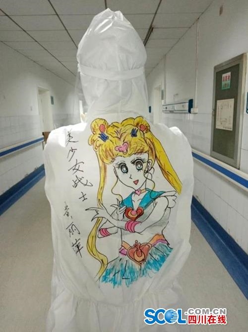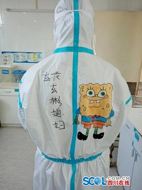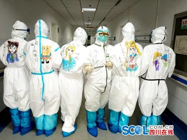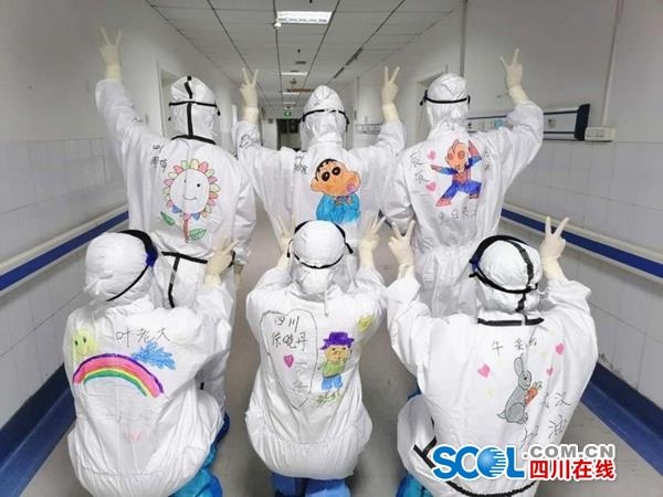 四川在线消息(孙丹 记者 蒲南溪)蜡笔小新、名侦探柯南、海绵宝宝、冰雪奇缘,还有武汉热干面……这些惟妙惟肖的漫画形象生动地手绘在川北医学院附属医院第一批援湖北医疗队队员们的防护服背后。这些“最萌”白衣战袍,更添温暖!