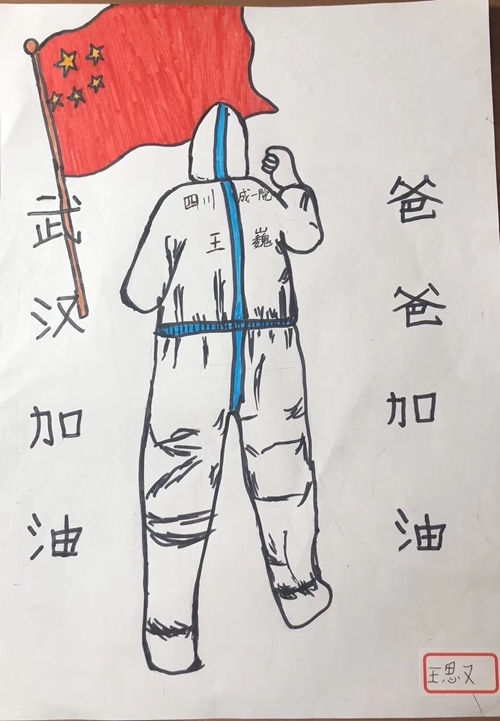 凌晨2点得到通知,早上7点就要出发,因每日接触呼吸道病人自行在外隔离的王巍没有办法回家与女儿告别。后来在得知爸爸已经前往湖北支援后,王巍的女儿王思又特意画了一张画,上面写“武汉加油、爸爸加油”为王巍鼓劲。
