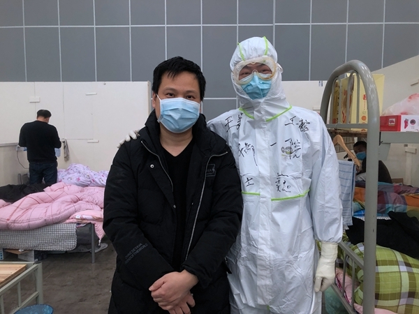 病人王巍1月20日第一次发烧,1月31日被确诊。2月11日,医院第二次检测结果一阴性一阳性,被收入武汉市汉阳国博方舱医院医治。刚一入院,他就遇到了前来查房的医生王巍。隔着厚厚的防护服,病人王巍看不清楚医生王巍的长相,也不知道眼前这个全副武装的医生竟然和他同名同姓。不过医生王巍身上穿着的防护服上写着“四川成一院王巍”的字样,还是让病人王巍心中一暖。这种奇妙的缘分也让两个王巍很快从医患关系变成了朋友。