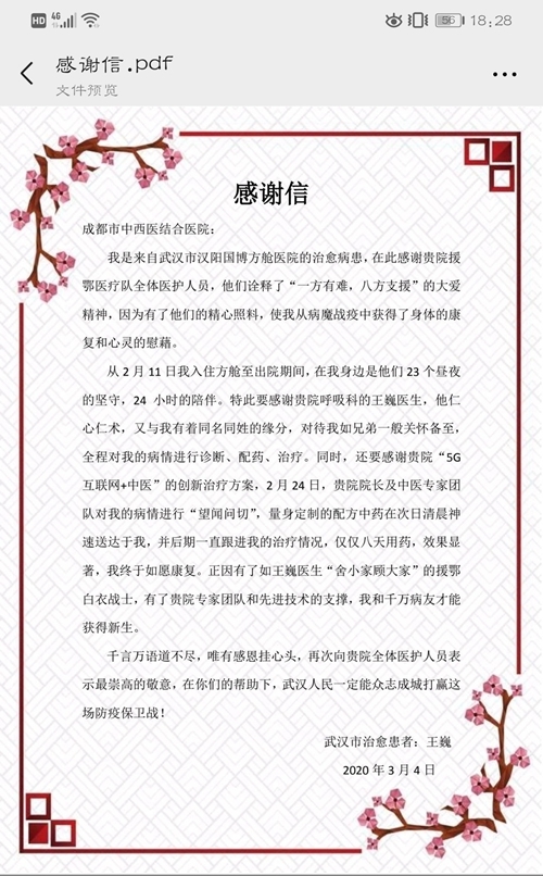 离开医院之时,病人王巍很是不舍。为此,他专门给医生王巍以及成都市第一人民医院写了一封感谢信。病人王巍在感谢信中写道:“王巍医生,他仁心仁术,又与我有着同名同姓的缘分,对待我如兄弟一般关怀倍至,全程对我病情进行诊断、配药、治疗……正因有了如王巍医生‘舍小家顾大家’的援鄂白衣战士,我和千万病友才能获得新生。”
