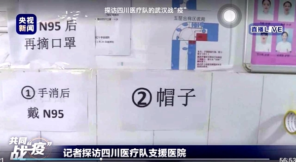 “这里就是医护人员穿脱防护用品的房间了。”我省第一批援助湖北医疗队院感组、四川大学华西医院感染管理部朱仕超向记者介绍道。从洗手、带医用防护口罩、戴一次性帽子、穿工作服……一直到鞋套,穿好防护用品,一共需要10步。由于步骤繁琐,大家特意将每个步骤打印出来,分块贴在墙上,以防某个出现疏漏。