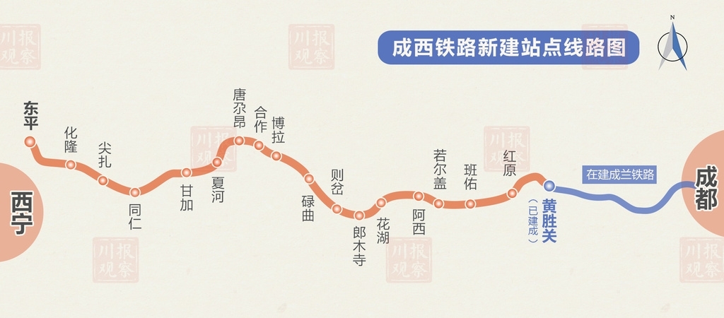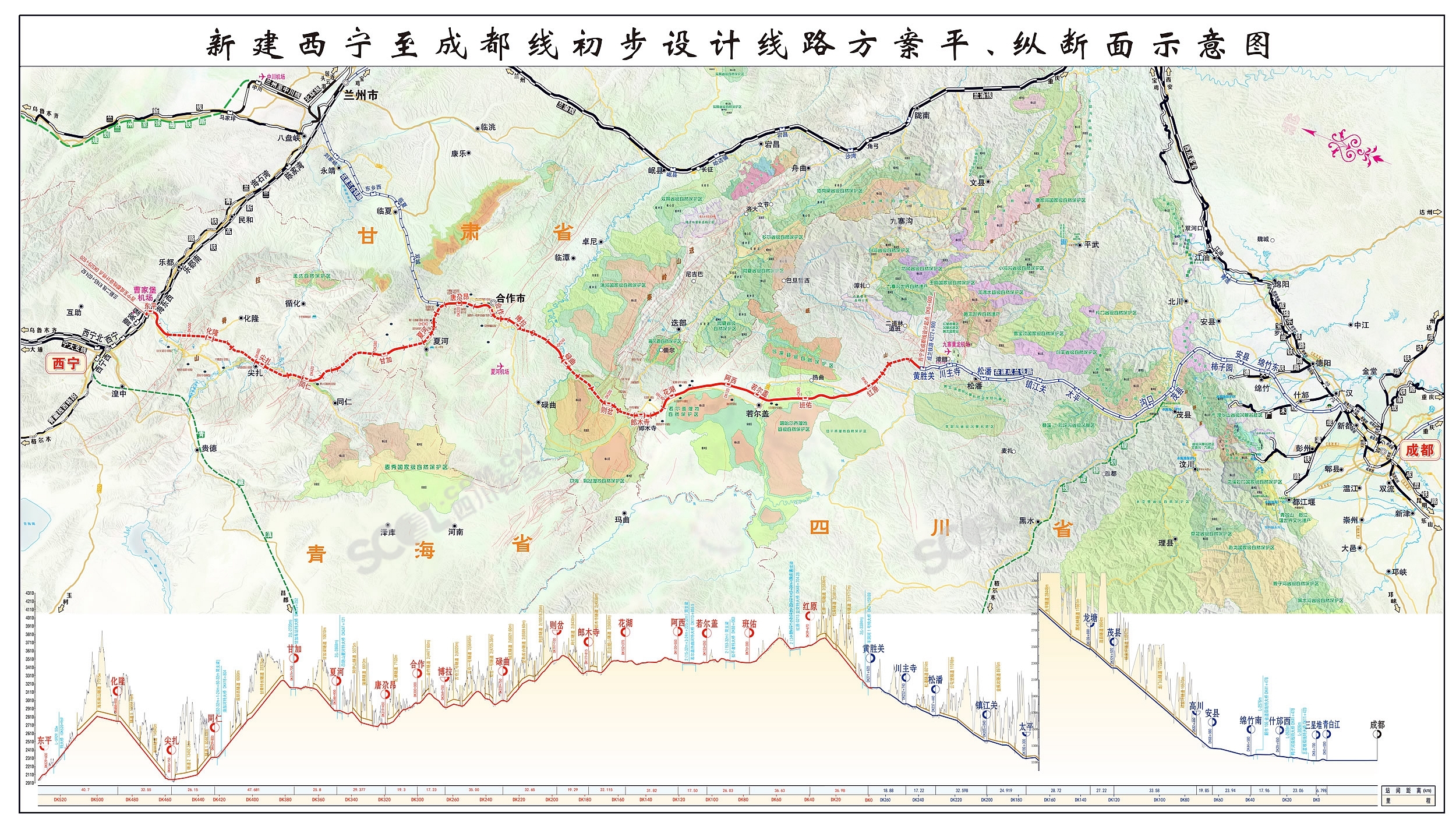 西宁至成都铁路走行于青藏高原东部边缘与黄土高原过渡地带,全线海拔在2000米以上,四川省境内段海拔均高于3000米,其中若尔盖到松潘之间的越龄地带轨面标高3760米,是全线海拔最高点。
