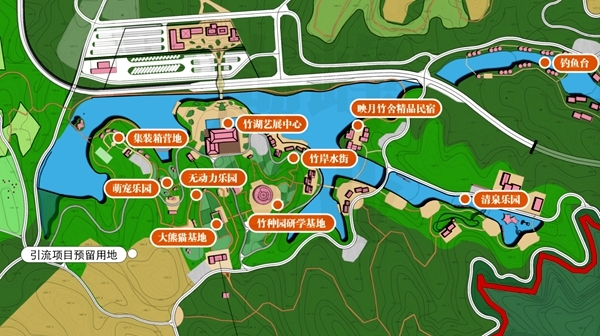 根据规划,景区项目将分三期建设,周期预计6年。一期主要建设综合门户中心,并植入休闲商业街、艺术展览中心、高端精品民宿、夜间光影秀、竹艺集市等项目。同时,将建设一个熊猫主题馆,拟引进两对大熊猫,这在川南尚属首家;二期着重利用沿线山、湖、崖场地形,打造独具特色的主题乐园、悬崖酒店、悬崖景观平台。结合竹文化元素,进行主题产品建设,打造一条动静清晰的文旅休闲带’三期围绕四季竹养度假区和原乡颐养度假区进行建设,结合现代生活需求,完善品质度假及服务配套,创新竹文化特色,打造一站式康养度假生活区。