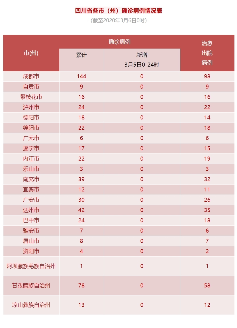 截至3月6日0时,四川省累计报告新型冠状病毒肺炎确诊病例539例,涉及21个市(州)。