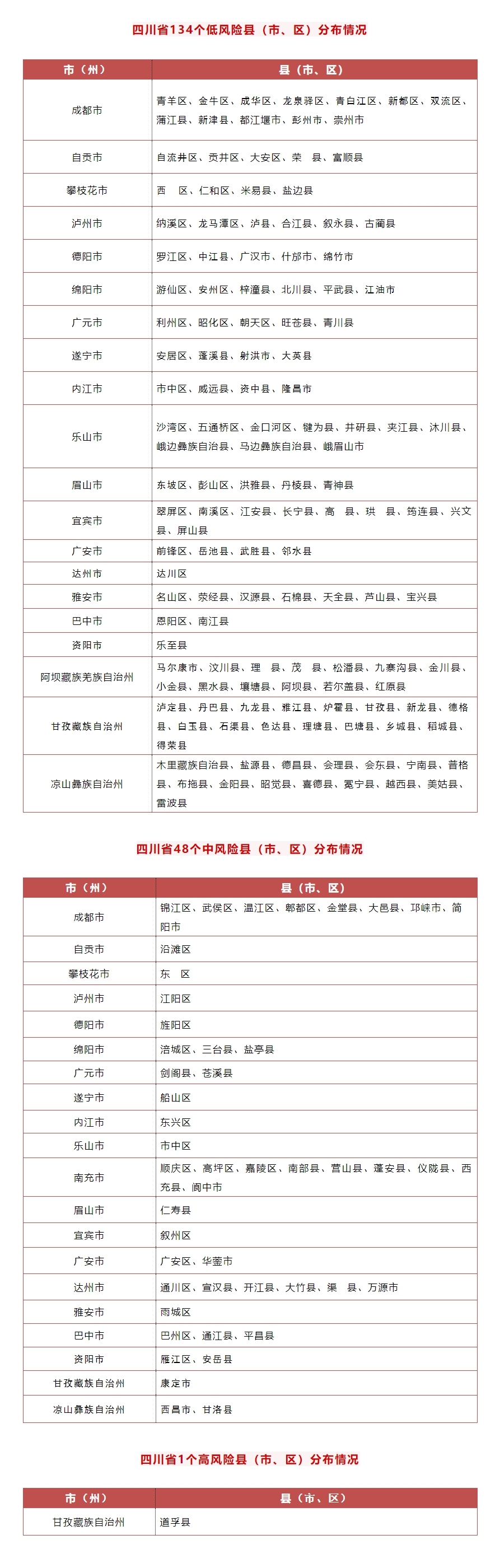 全省现有无现症病例区(低风险县<市、区>)134个、散发病例区(中风险县<市、区>)48个、社区暴发和局部流行区(高风险县<市、区>)1个(过去24小时新增岳池县为低风险县<市、区>)。