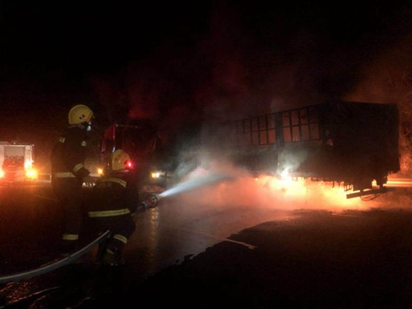 根据现场情况,消防救援人员出一支水枪对车厢火势进行控制,同时再出一支水枪给车辆油箱周围降温,并在附近200米之外设立警戒线。