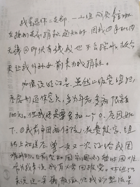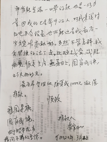 四川在线消息(记者 范芮菱)3月6日,记者从四川大学华西医院获悉,华西医院退休职工、89岁的老党员秦宜珈,近日在得知组织号召党员自愿为疫情捐款后,捐款1000元,并亲手写了一封信,希望组织一定要接受这份特殊的党费——“以前组织上一次次给我帮助,我有义务回报党,哪怕是能多添一点口罩,也是一份力量。虽然我已经奔9了,我会坚强的活下去,迎接战胜病魔、恢复生产、蒸蒸日上、国富民强的大好时光。”为这位奔九的老党员、老华西人点赞!