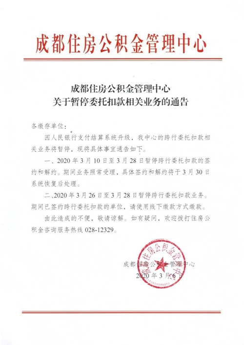 四川在线消息(记者 文强)3月6日,记者从成都住房公积金管理中心获悉,因人民银行支付结算系统升级,成都住房公积金管理中心的跨行委托扣款相关业务将暂停。