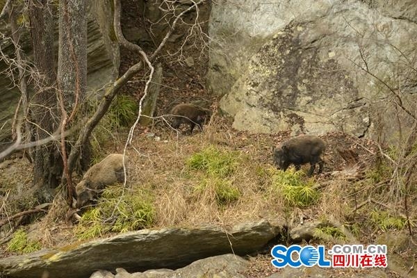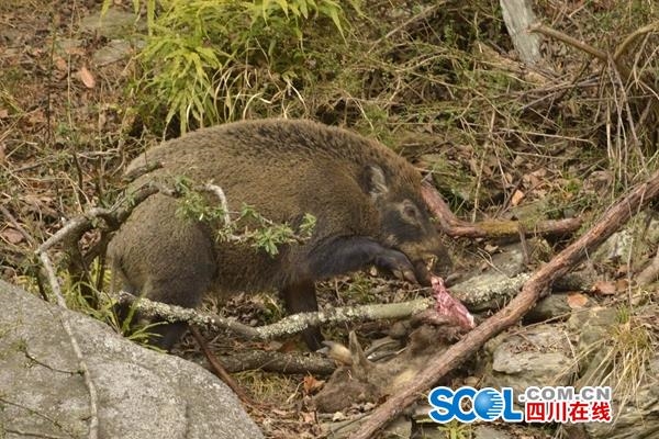 日前,唐家河国家级自然保护区工作人员在保护区进行日常工作巡查中,在蔡家坝保护站百雄关区域发现了一幕“精彩画面”—— 一群野猪在抢食一具动物尸体!细看之下发现,这群野猪由一只雄性、一雌性和一只雄性亚成体组成。