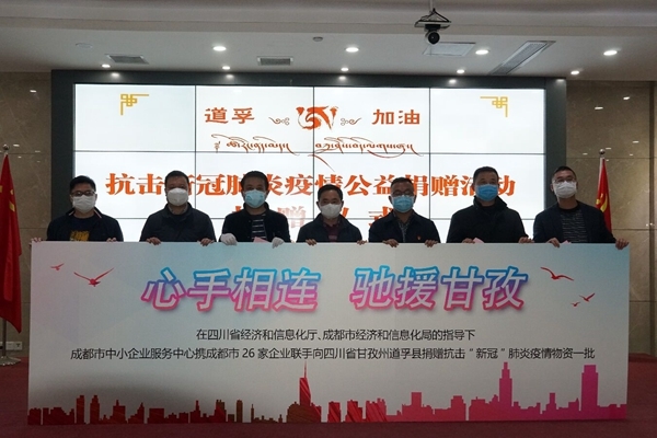 3月6日15点50分,两辆大型货车由成都市中小企业服务中心驶向甘孜州道孚县经信局,车上装着的是成都数十家企业捐赠的各种物资——3月3日,在四川省经济和信息化厅、成都市经济和信息化局的指导下,成都市中小企业服务中心党支部向成都市企业家朋友们发出援助道孚县的公益捐赠倡议书。两天时间,该市26家企业慷慨解囊,中心为道孚县共募集到医用护目眼罩120个、消毒液4桶、N95口罩1000只、一次性医用口罩6260只、额温枪9支、消毒枪3个、一次性隔离衣300套、防护服300套、消毒品(三氯异氰尿酸)50斤、环保厕所4座、牛奶110箱、大米8600斤、食用油1359.2升、挂面5010斤、方便面1560桶、土鸡蛋2000个、护手霜100支、电热毯241床……