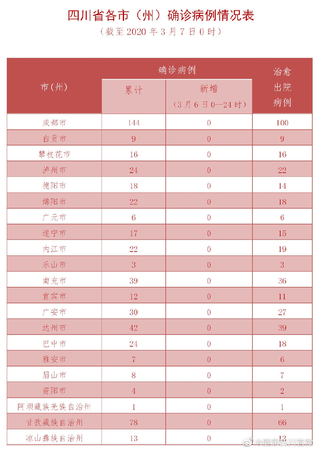 四川在线消息(记者 石小宏 殷鹏)3月6日0-24时,四川省新型冠状病毒肺炎无新增确诊病例,新增治愈出院病例20例,无新增疑似病例,无新增死亡病例。