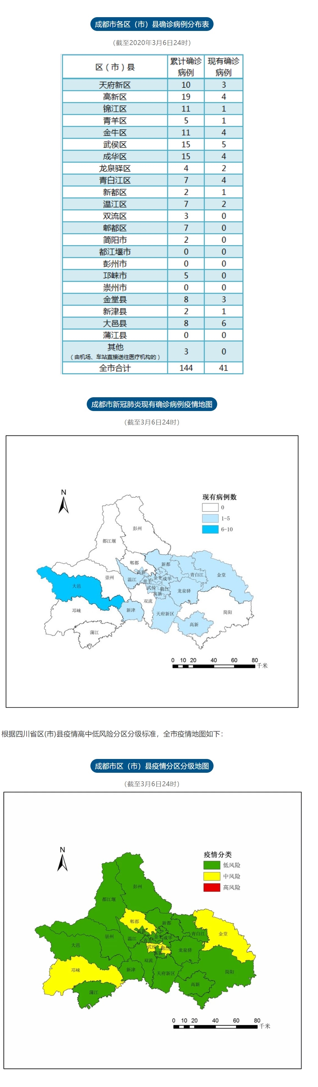 截至3月6日24时,成都市累计报告确诊病例144例,累计出院100人,死亡3人,其余41人均在定点医院隔离治疗,60名密切接触者正在接受医学观察。据悉,成都市累计确诊病例144例,目前已经累计出院100例。