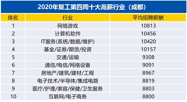 四川在线消息(记者 钟振宇)为帮助都市白领了解疫情下的就业市场情况,智联招聘从2月3日以来开始对北京、上海、成都等全国38个城市的招聘和求职进行大数据进行分析,并采取周报形式进行发布。3月7日发布的第四期周报显示,成都地区网游行业的平均薪酬,已连续三周雄踞成都各行业榜首。