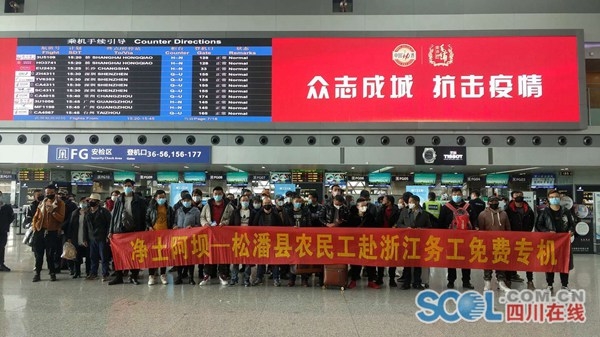 四川在线消息(周琳 向菲 记者 徐中成)3月7日,成都双流机场内,232名阿坝州籍农民工分别乘坐两个航班,免费“坐飞的”飞往浙江务工。据介绍,这也是新冠肺炎疫情发生后,阿坝州首次以包机的形式向省外输送务工人员。