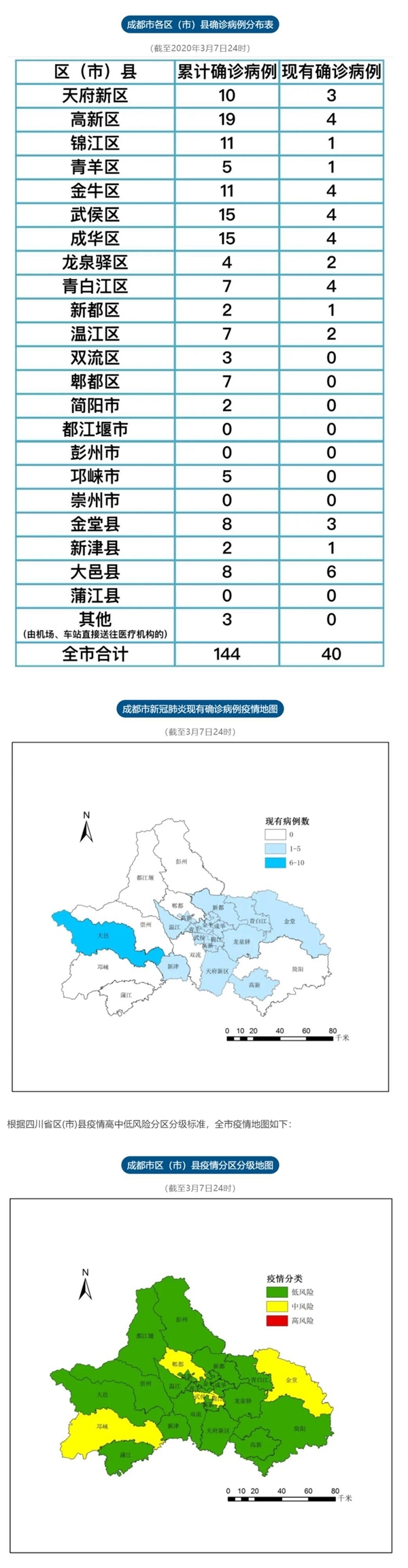 截至3月7日24时,成都市累计报告确诊病例144例,累计出院101人,死亡3人,其余40人均在定点医院隔离治疗,63名密切接触者正在接受医学观察。