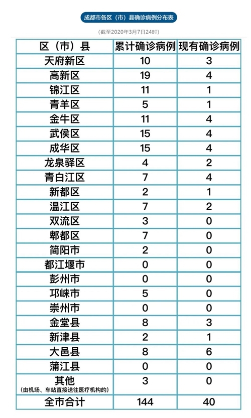 3月8日,记者从成都市卫健委获悉,根据成都市各区(市)县确诊病例分布表,截至3月7日24时,成都市累计病例144例,现有病例40例。与昨日的数据相比,成都市现有确诊病例减少1例。具体情况为,成都市武侯区减少1例现有确诊病例。