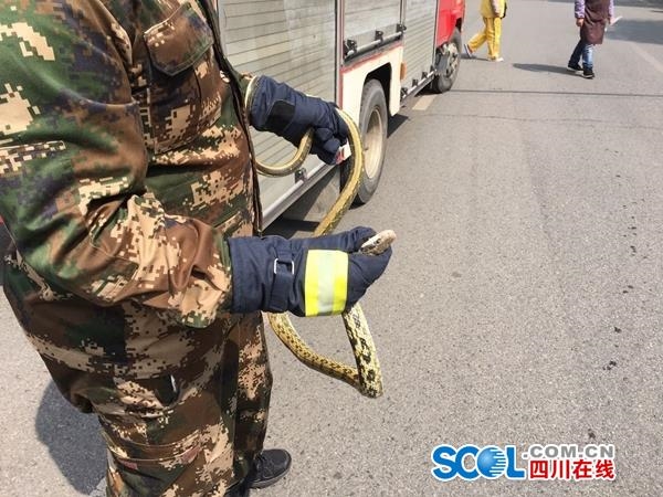 这不,3月7日下午,在成都市郫都区,市民报警求助声称新南街中国银行楼下有一条花蛇。郫都区消防救援大队书院街专职队接到报警后立即出动一辆救援消防车4名队员赶往现场处置。