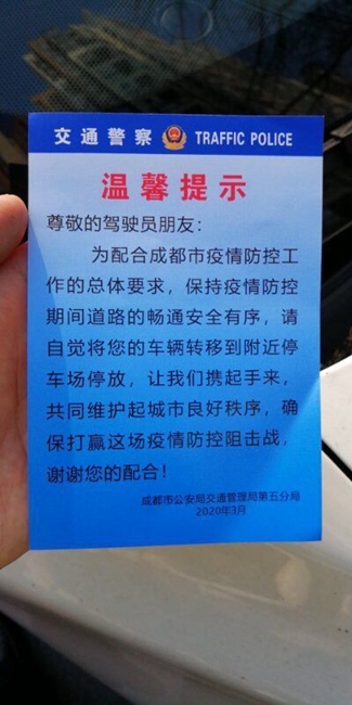记者从成都市交警五分局了解到,为了做好复工复产道路交通安全及秩序管理,分局采取了一系列措施,其中对乱停放的车辆贴蓝色的温馨提示单便是其中之一,通过这种方式,提示驾驶员将车辆转移至就近的停车场。