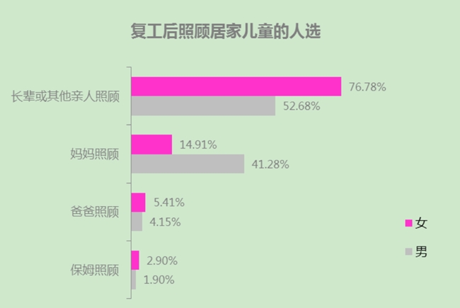 对于复工后谁来照顾孩子这一问题上,爸爸妈妈们也各有偏好。职场妈妈更倾向于让长辈或亲人帮忙带娃,占比76.78%,有52.68%的职场爸爸也做了这一安排;另外还有41.28%的职场爸爸选择让妈妈照顾孩子,这意味着职场爸爸更倾向于将带娃的负担转嫁给妈妈。然而随着越来越多的女性在职场中也在奋力拼搏,这势必让职场妈妈更加难以顾全和平衡工作与家庭。