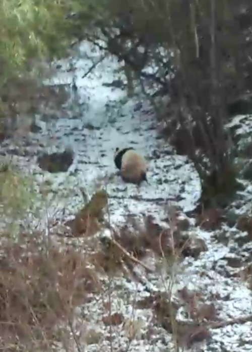 又是一个刚下完雪的清晨,四川卧龙国家级自然保护区道路养护员谭友铅像往常一样出门维护自己负责的路段。最近过往车少,上午10点左右便完成养护工作。他骑上三轮车,准备返回道班房休息。突然,远远的一个动物从树丛里蹦上了公路,动作有些憨憨的,黑白色圆滚滚的。