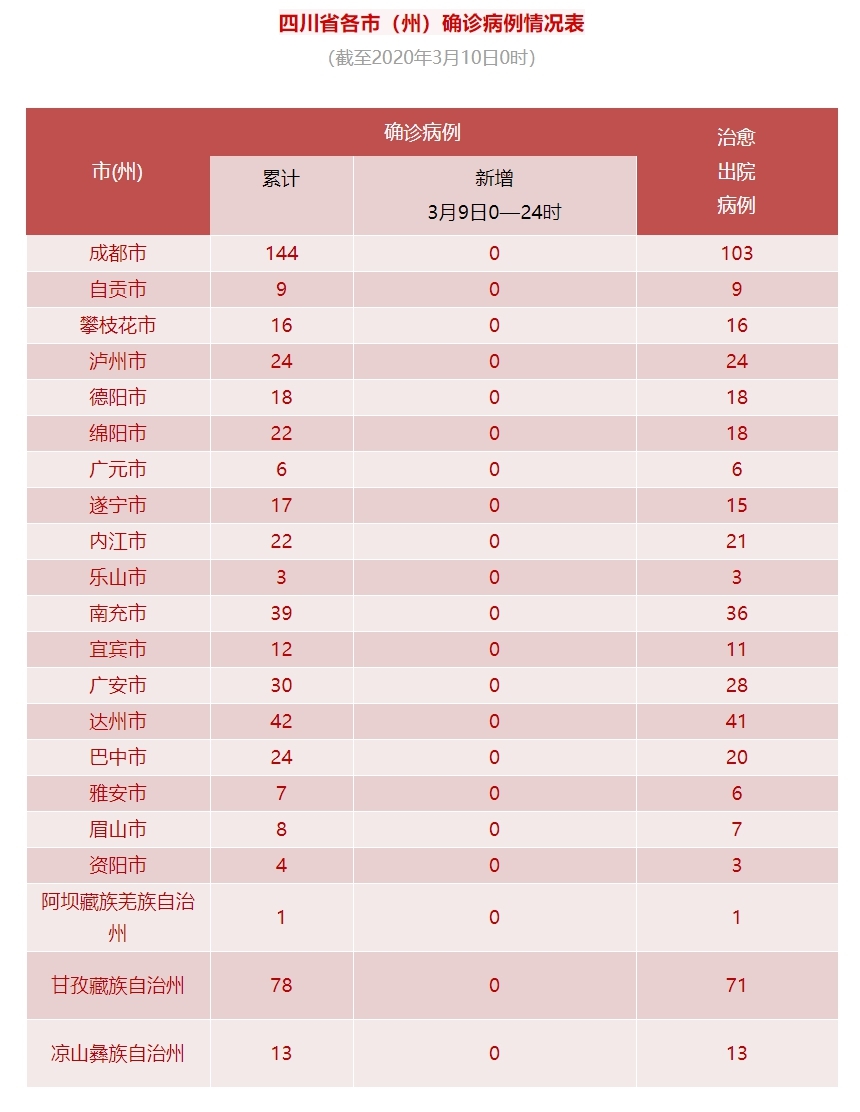 截至3月10日0时,四川省累计报告新型冠状病毒肺炎确诊病例539例,涉及21个市(州)。