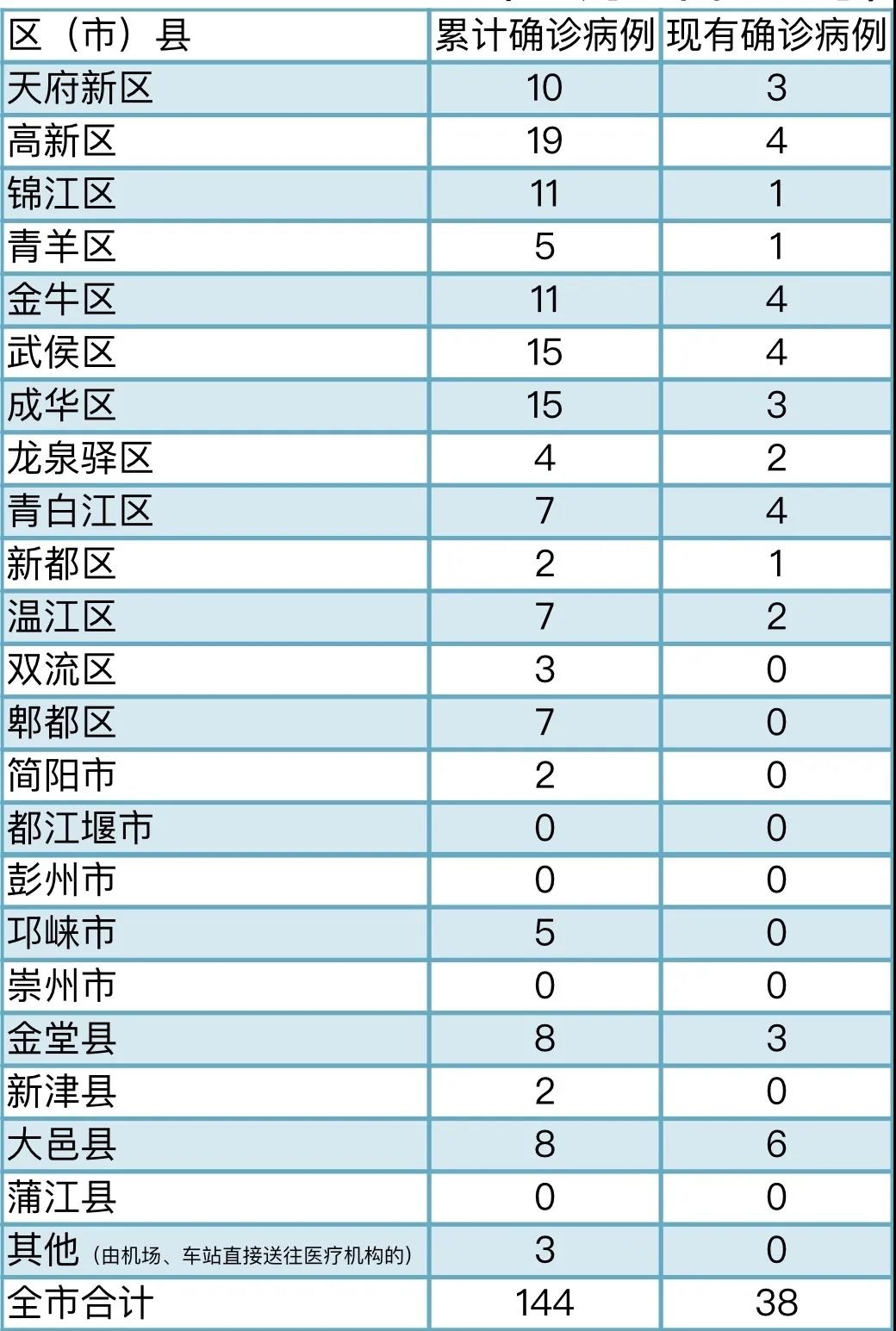截至3月9日24时,成都市累计报告确诊病例144例,累计出院103人,死亡3人,其余38人均在定点医院隔离治疗,58名密切接触者正在接受医学观察。