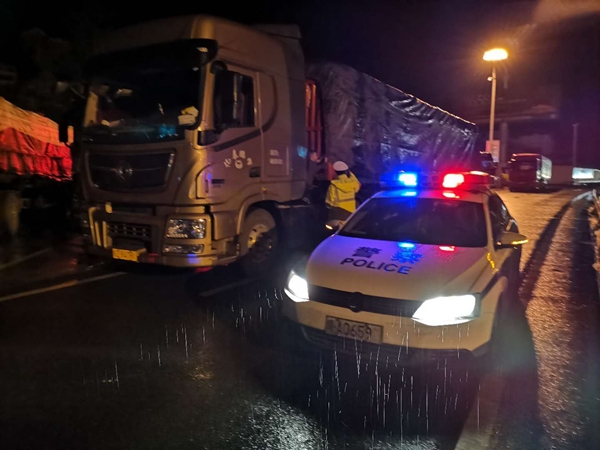 目前,交警在管制点对车辆实施警车带道通行,提醒司机注意控速控距。