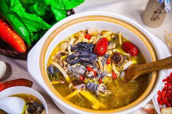 剑门关土鸡历史上就是名鸡,据说唐安史之乱时期,玄宗出走四川,因在马嵬坡折了杨贵妃,一路茶饭不香。途经剑门关,乡民摆上豆腐宴、百鸡宴接驾,玄宗胃口顿开,心情大好,“心灵鸡汤”由此传颂开来。从此,剑阁人对剑门关土鸡视为宝物,凡有贵客驾临或心情不爽,就奉上一碗“心灵鸡汤”,一碗不行就两碗。