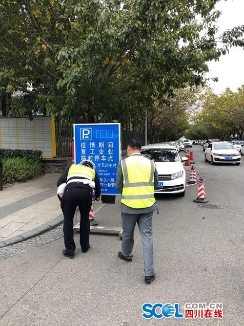 除此之外,新创路对应蓝光集团,科新南路对应京东方,天勤路对应西区驾考考场,双柏路对应旺旺集团……成都交警六分局五大队为辖区10多家企业规划了近20个疫情期间复工企业临时停车点位,共计约200个临时停车位。这些停车位由交警和企业共同管理,专门提供给相应企业的员工免费停车使用。