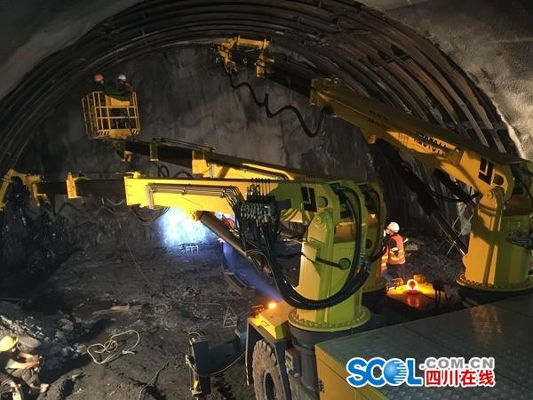 长长隧道,灯光昏暗。一个人的声音特别响亮:“等下,灌浆压力一定要达到0.4兆帕,这样围岩注浆才饱满。”3月10日上午,在阿坝州松潘县成(都)兰(州)铁路云屯堡隧道正线成都端小里程掌子面施工现场,中铁二局集团有限公司成兰铁路工程指挥部第二作业队队长彭代建向正在进行锚杆注浆施工的6名工人不停地发出指令,随着源源不断的注浆通过锚杆渗透进去,围岩慢慢凝结加固。