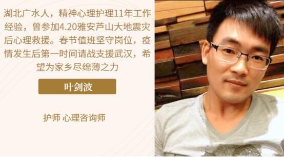 “新冠肺炎对重症病人生命健康的影响严重,是因为没有足够的‘氧’通过肺到心,到身体的每一个部位。新冠肺炎对患者、家人、医务工作者和其他很多人也会产生影响,那是因为‘爱’不能够及时有效地通过‘心’,传递到每一天的正常活动中。”作为一名心理咨询师,叶剑波同他的团队一起,用爱是化解冲突,用尊重和认可默默地帮助着武汉一线的医护人员和患者们。