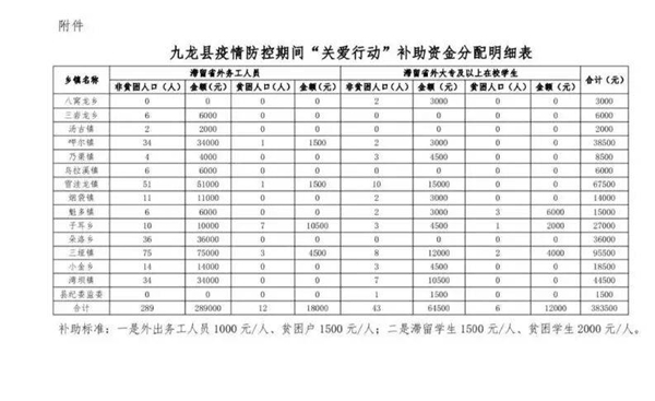 原来,新冠肺炎疫情期间,九龙县有许多农村务工人员和学生滞留外地。既无收入,也无法返乡,有的生活一度面临困难。为体现县委县政府的关心关爱,经九龙县应对新冠肺炎疫情防 控领导小组暨指挥部研究决定。由县疫情防控指挥部办公室牵头,各乡(镇)、相关单位对滞留省外未返县大专以上学生及农村务工人员进行全面清理。由县财政资金给予一次性生活补贴。