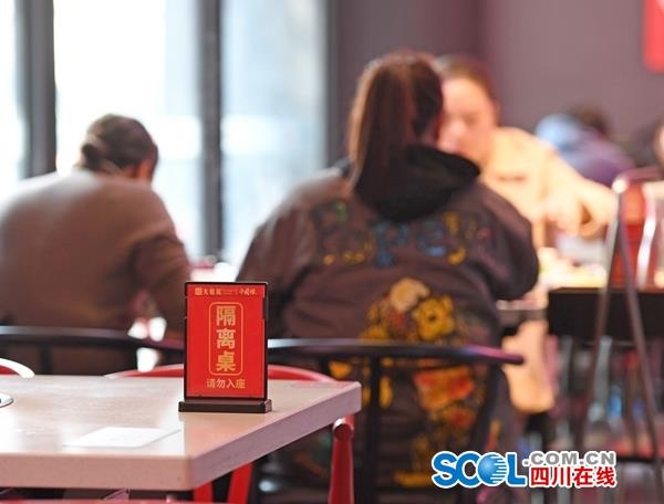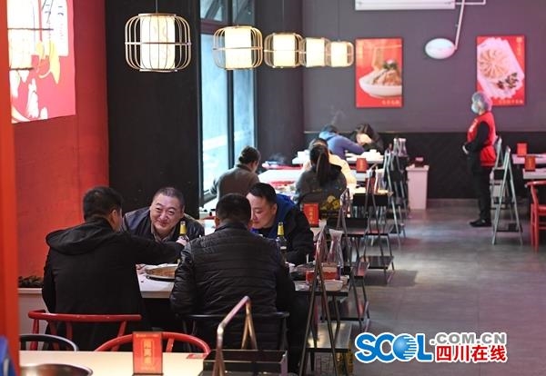 3月11日中午,成都市大龙燚火锅玉林店内,三桌食客在此享用热腾腾的火锅。目前,成都市部分火锅店已恢复堂食,开门营业。