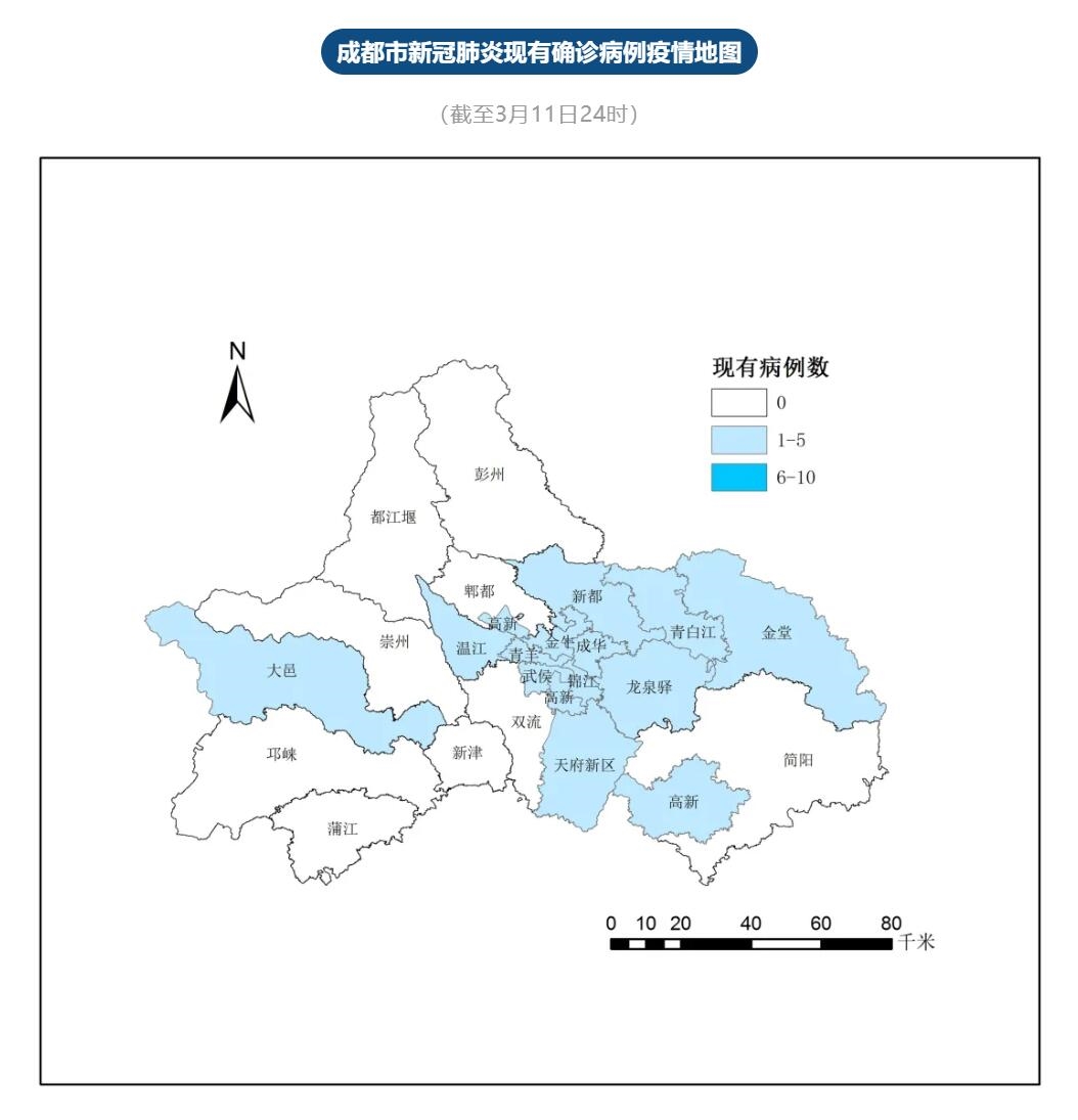 四川在线消息(记者 张庭铭)3月12日,记者从成都市卫健委获悉,截至3月11日24时,成都市新冠肺炎现有确诊病例疫情地图更新,成都市大邑县由6-10例地区,变为1-5例地区,现有确诊病例减为4例。自此,成都市现有确诊病例1-5例地区增加到12地。