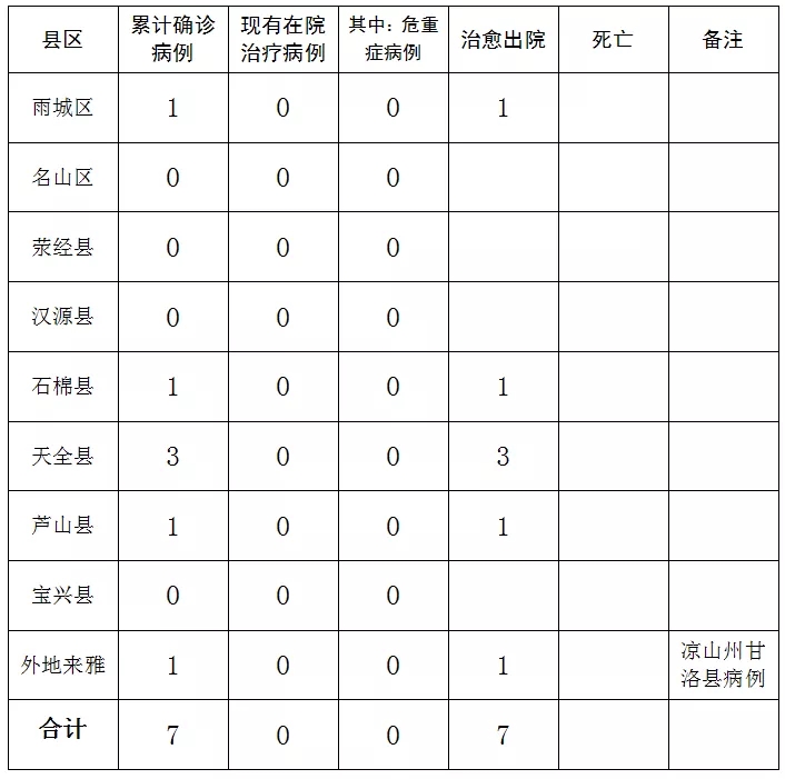 四川在线消息(记者 文莎)3月12日上午,记者从雅安市卫健委获悉,截至3月11日24时,雅安市累计确诊新冠肺炎病例7例,治愈出院7例,确诊病例已全部治愈出院。