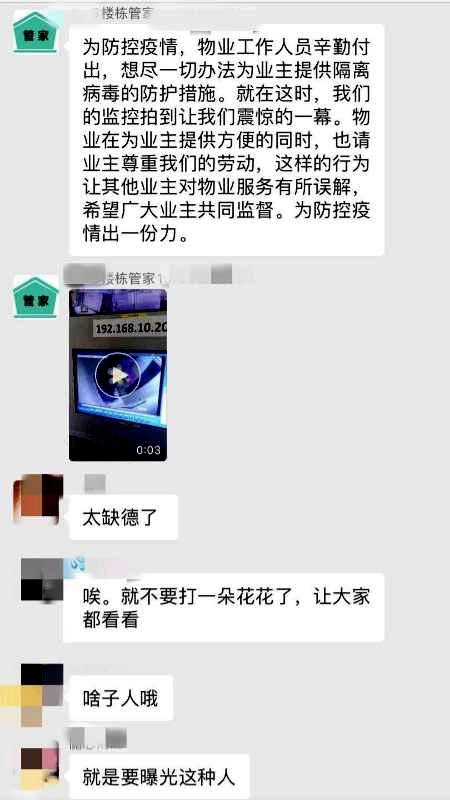 “物管把一段监控画面发在业主群里,业主都非常气愤”,说起监控内容,谢女士非常生气,据物业调查到的所有监控显示,这位女业主不仅是拿了自己所住楼房的电梯卫生纸,小区内8栋楼电梯里的按电梯专用纸都被她拿过。“电梯里的抽纸被拿的情况持续约一周了,我们每天下午3点左右会更换一包新的抽纸,但近几天每天都有小区业主反映说电梯里的抽纸老是是空的”,嘉恒物业工作人员李女士介绍,在调取了电梯监控后他们发现,该名女业主只要看到更换了新的纸巾便会一把拽走,顺便去不同单元“扫楼”,“我们把监控进行处理后发在小区业主群,就是希望大家合理使用防疫物资,对这样不文明的行为共同进行监督。”