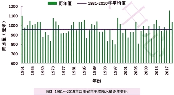 气象监测显示:2019年,四川全省年平均气温15.4℃,较常年偏高0.5℃,排1961年有气象记录以来第9高位;全省年平均降水量1034.4毫米,较常年偏多8%,位居1961年有气象记录以来第16多位。年内暴雨、大暴雨天气多,区域性暴雨过程多,属暴雨偏多年份。
