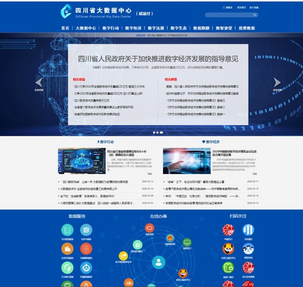 据了解,该网站是四川大数据应用发展总门户(访问地址:www.scdsjzx.cn),网站立足四川,放眼全国,聚焦数字政府、数字经济建设,以赋能全省数字产业、数字经济发展为目标,通过开设“数字行动”“数字经济”“数字法规”“数字生态”“数据跑腿”“数智讲堂”等8大类共计26个栏目,着力打造四川数字经济权威发布平台、数字产品及服务宣传平台、高效便民办事服务平台、引领全省大数据行业发展学习交流平台。其中,“数字行动”栏目:将党中央、国务院有关大数据应用发展的工作部署,作为四川推进大数据应用研究,服务数字政府建设、促进数据经济发展的基本工作遵循,汇聚展示全省有关大数据应用发展的各类工作部署、新闻信息、政策文件等;同时通过“数字前沿”分栏目展示外省市有关大数据应用的前沿研究和经验做法;“数字经济”栏目:聚焦全国大数据应用研究的融合创新和案例分析等,打造全省城市机会清单、数字经济指数、大数据示范应用、平台经济和新经济发展现状等的权威信息发布平台,着力为全省数字经济应用研究“搭台唱戏”,推动相关部门、企业单位在数字经济应用研究方面共促共融、互联互通。“数字生态”栏目:聚焦大数据应用研究,数据共享开放,合作工作体系、政策体系等,搭建全省数据共享应用体验展厅,全方位、立体式展示我省大数据应用研究、对外开放合作的最新动态。