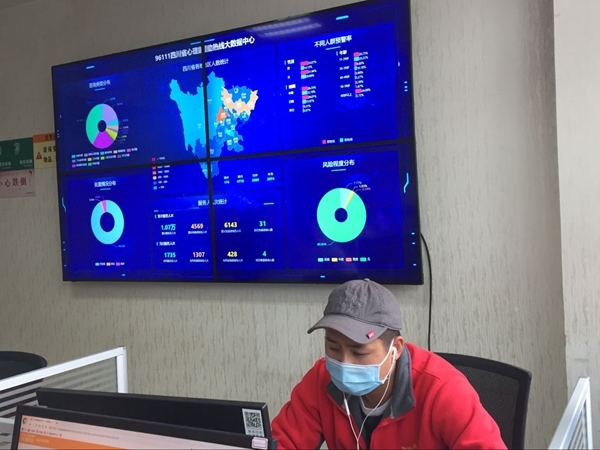 在四川省精神医学中心的热线电话室里设置了3席,实行24小时运行,网络应答分成6个组,根据咨询人数机动灵活安排接线人员,四川省通信管理局自2月17日起,分时段分批次向全省手机用户发送96111热线的公益短信。当天,热线量突增100多个,最密集时一岗半小时接了十几个电话,群众通过网络咨询也突增1000多条,热线管理员临时指挥调度18名志愿者工作到凌晨。截至目前,96111心理援助平台共有志愿者266人,其中省政府7部门志愿者14人、社会志愿者149人,省医院、省精神医学中心职工103人。