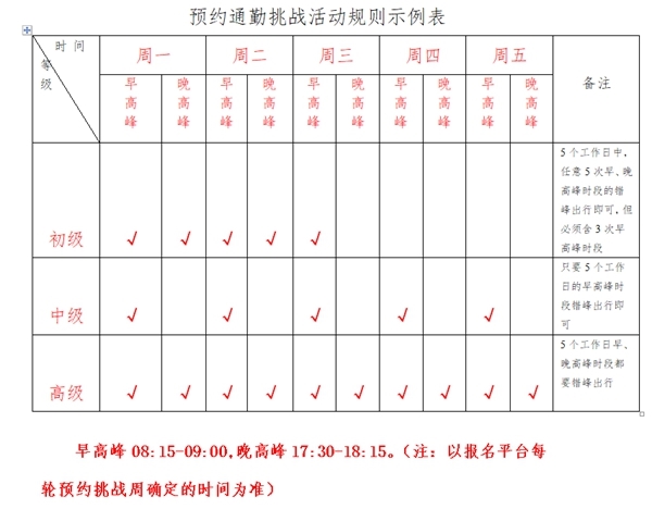 答:活动开始前,挑战者应确定拟参加的预约通勤挑战级别,选定后不得更改。其中,初级挑战:挑战周内完成5次早晚高峰时段的错峰出行,应含3次早高峰时段;中级挑战:挑战周内完成5个工作日早高峰时段的错峰出行;高级挑战:挑战周内完成5天工作日早晚高峰时段的错峰出行。