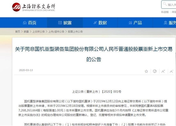 公告显示,国机重装于2019年12月12日向上交所提出股票重新上市申请,上交所于2019年12月18日受理。根据上交所上市委员会的审核意见,上交所同意国机重装A股股票7,268,263,664股(每股面值1.00元)在上交所重新上市交易。