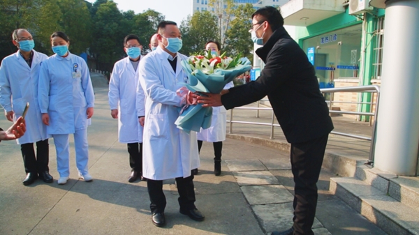 田旭出院时,第三人民医院院长罗镔为他送上鲜花