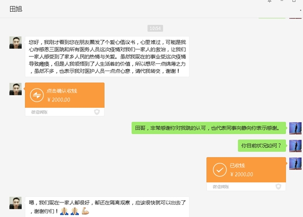 “想尽一点绵薄之力,虽然不多,也表示我对三医院医护人员一点点心意。”田旭说,当他看到这条朋友圈发布的这份爱心倡议书时,他心里难过,“这次我们一家三口感染新冠肺炎,是三医院的医护人员们不畏生死,日夜奋战在疫情防控救治的第一线,用精湛的专业技能和耐心细心的护理,才有了我们的康复,让我们一家人感受到了家乡人民的热情与关爱。”