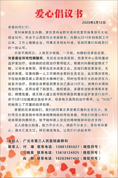一方有难八方支援。3月12日,向静所在的麻醉科发出爱心倡议书。3月13日,医院同事将爱心倡议转发至朋友圈,田旭从朋友圈看到后,第一时间联系了广元市第三人民医院党委办公室,通过微信转账,将2000元爱心善款转到市第三人民医院党委办工作人员微信上。