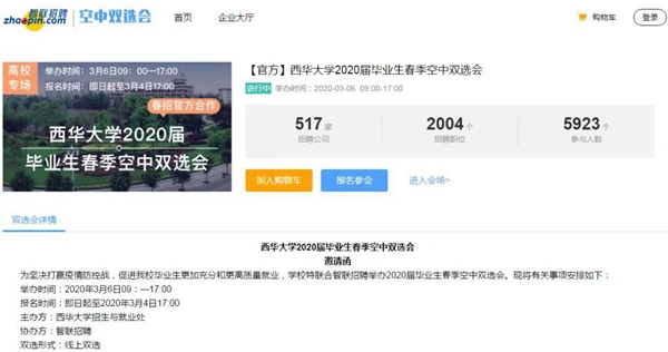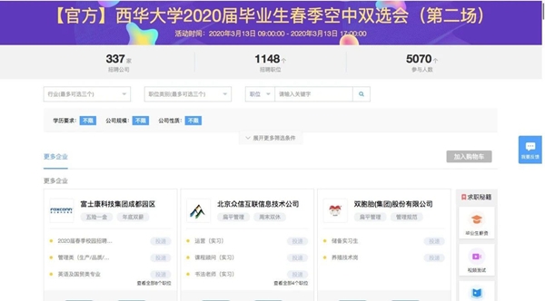 3月13日,西华大学2020届毕业生“春季空中双选会(第二场)”举行。来自全国各地的337家企事业单位为本次双选会提供了1166个职位,计划招聘人数为23453人。截至下午5点,来自全国601余所高校的4997名求职者参与此次空中双选会。西华大学毕业生共计1781名同学有效投递简历6373人次。