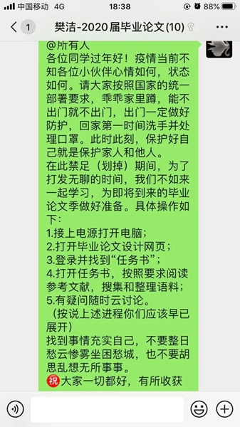 计算机与软件工程学院老师在线为毕业生指导论文,经常询问学生的写作进度,耐心回答学生们提出的每一个疑问。