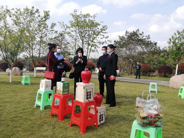 泸州市中院、江阳区法院知识产权庭的法官,在丹林镇樱花谷开展知识产权服务乡村振兴法治宣传活动。郭荞璐摄。