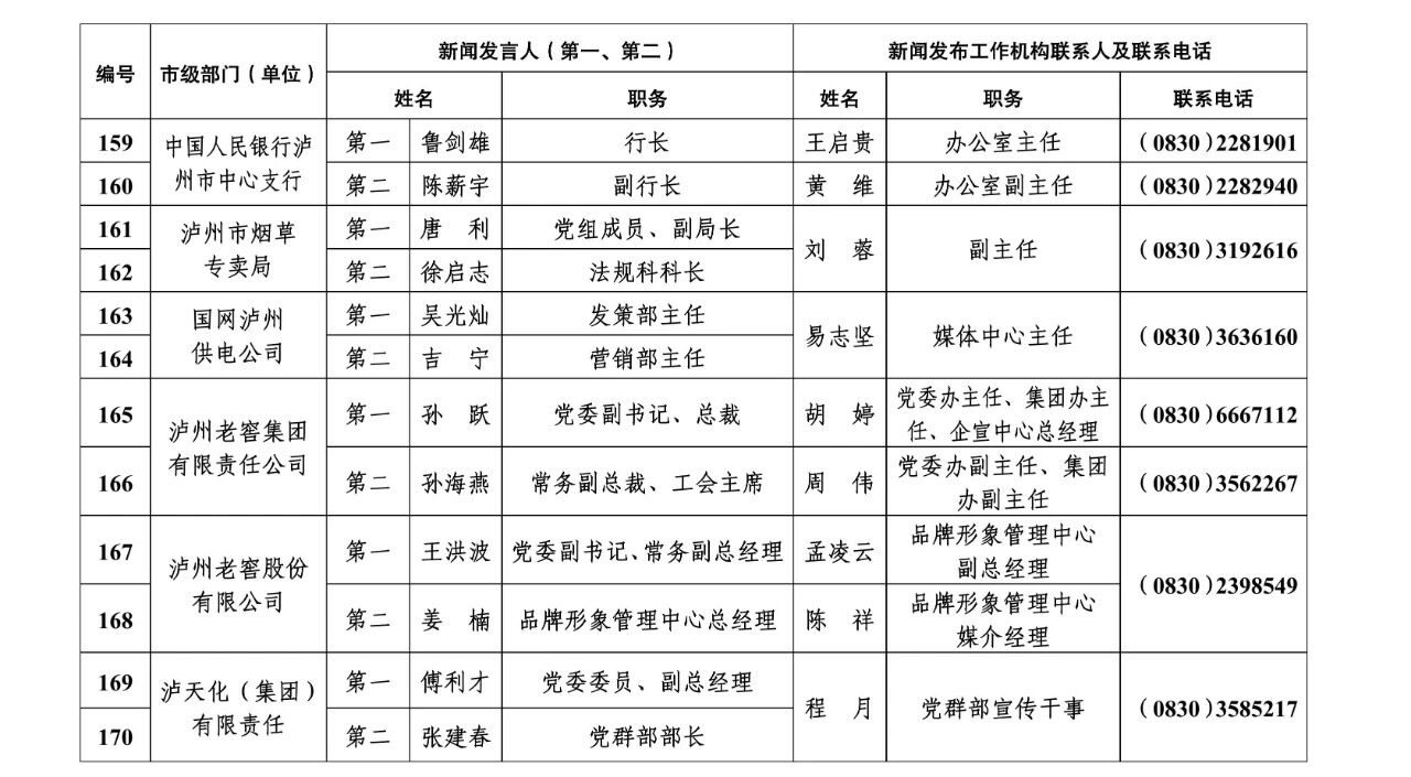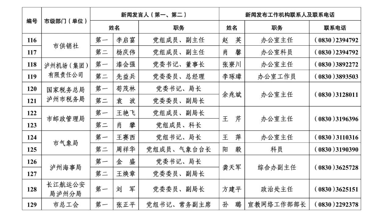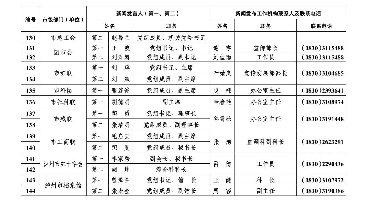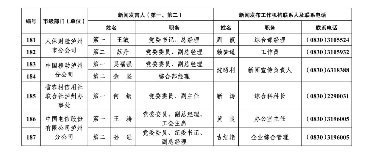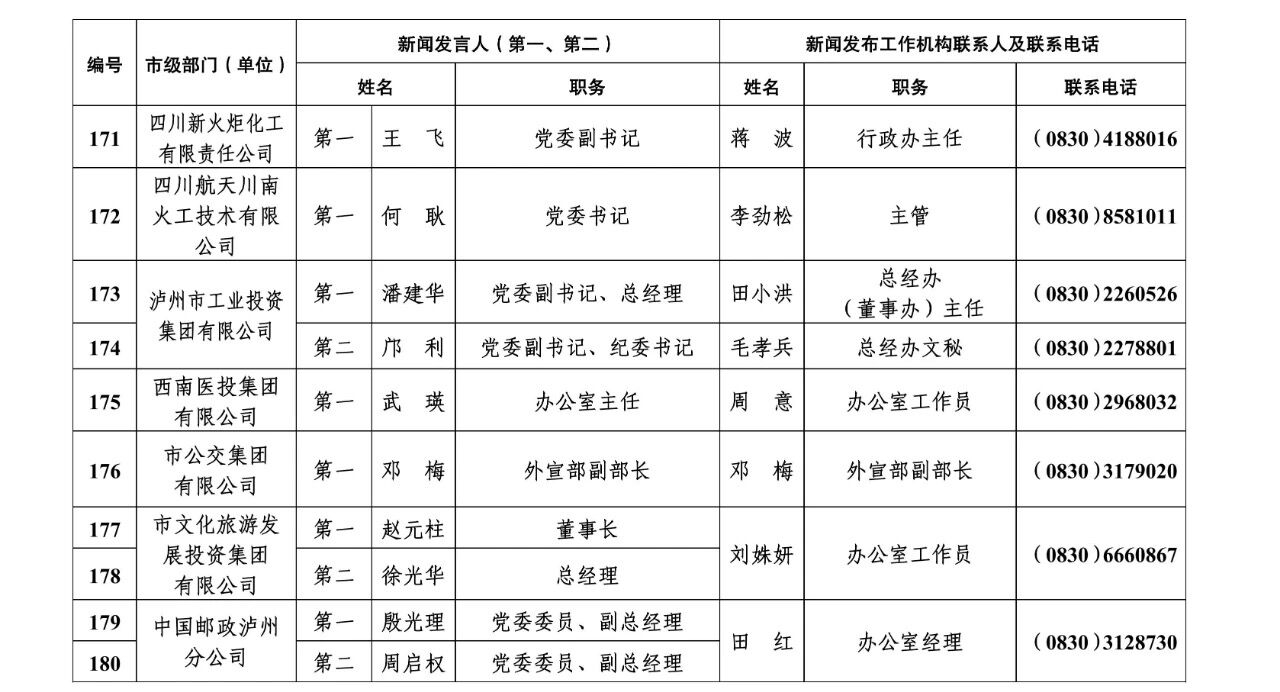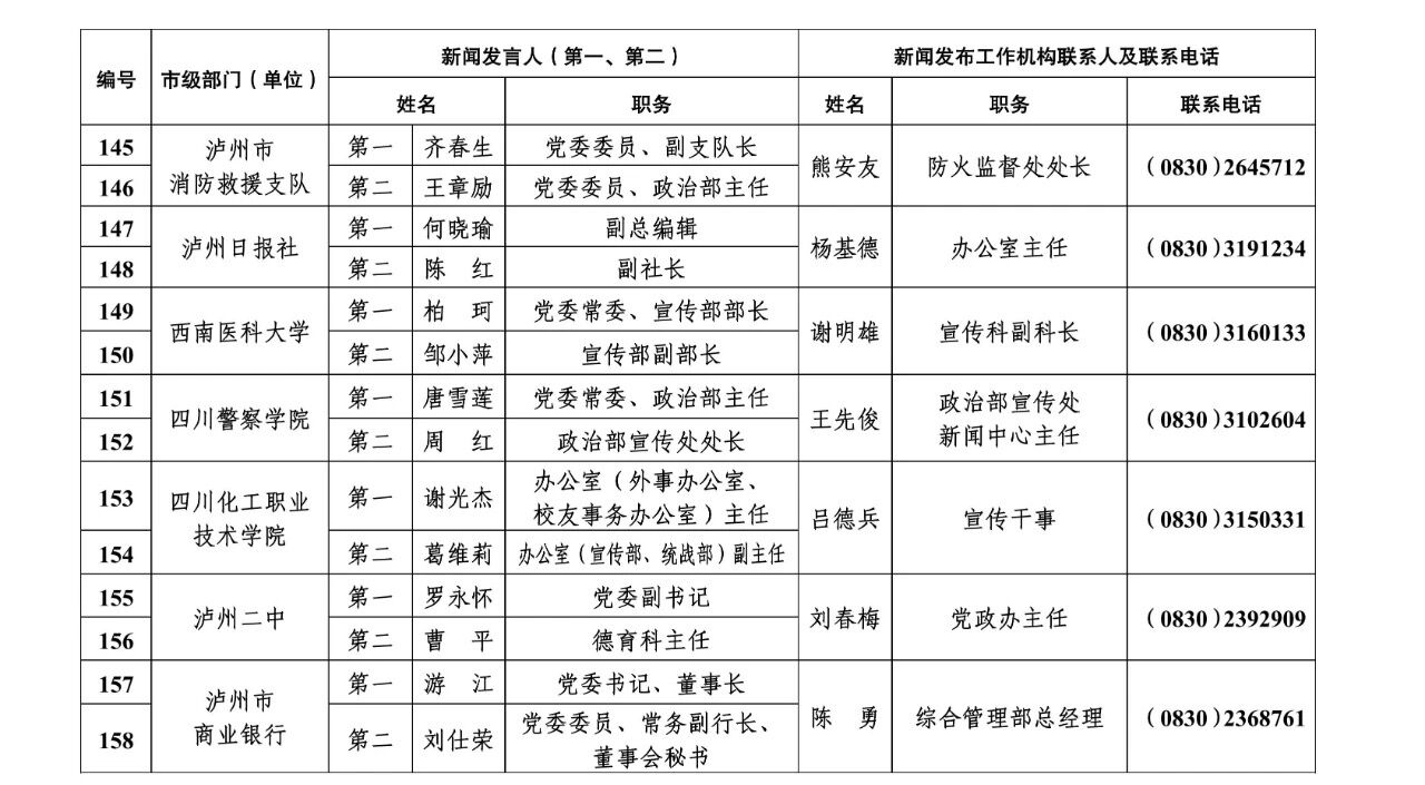 记者留意到,泸州市新闻发言人共213人,包含187名市级部门(单位)新闻发言人、26名县(区)发言人名单。同步发布的新闻发布工作机构电话,覆盖全市101个市级部门(单位)以及三区四县。